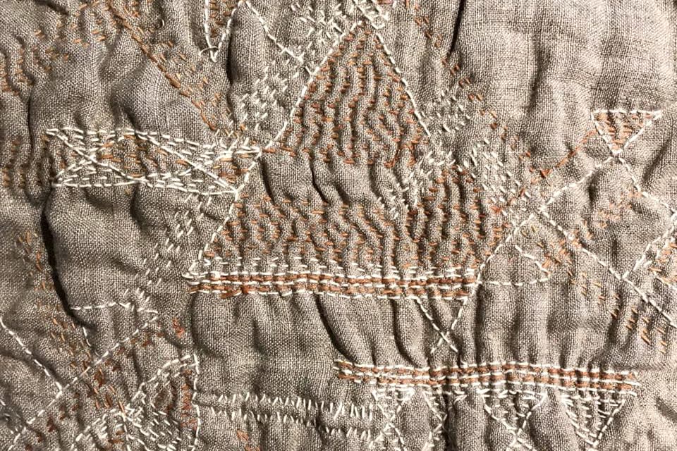 布地の色が幾重にも重なって、その上から様々な糸が刺されていく、絵を描くように…力強く、そして繊細に。何色でもない色、それがOM色です。